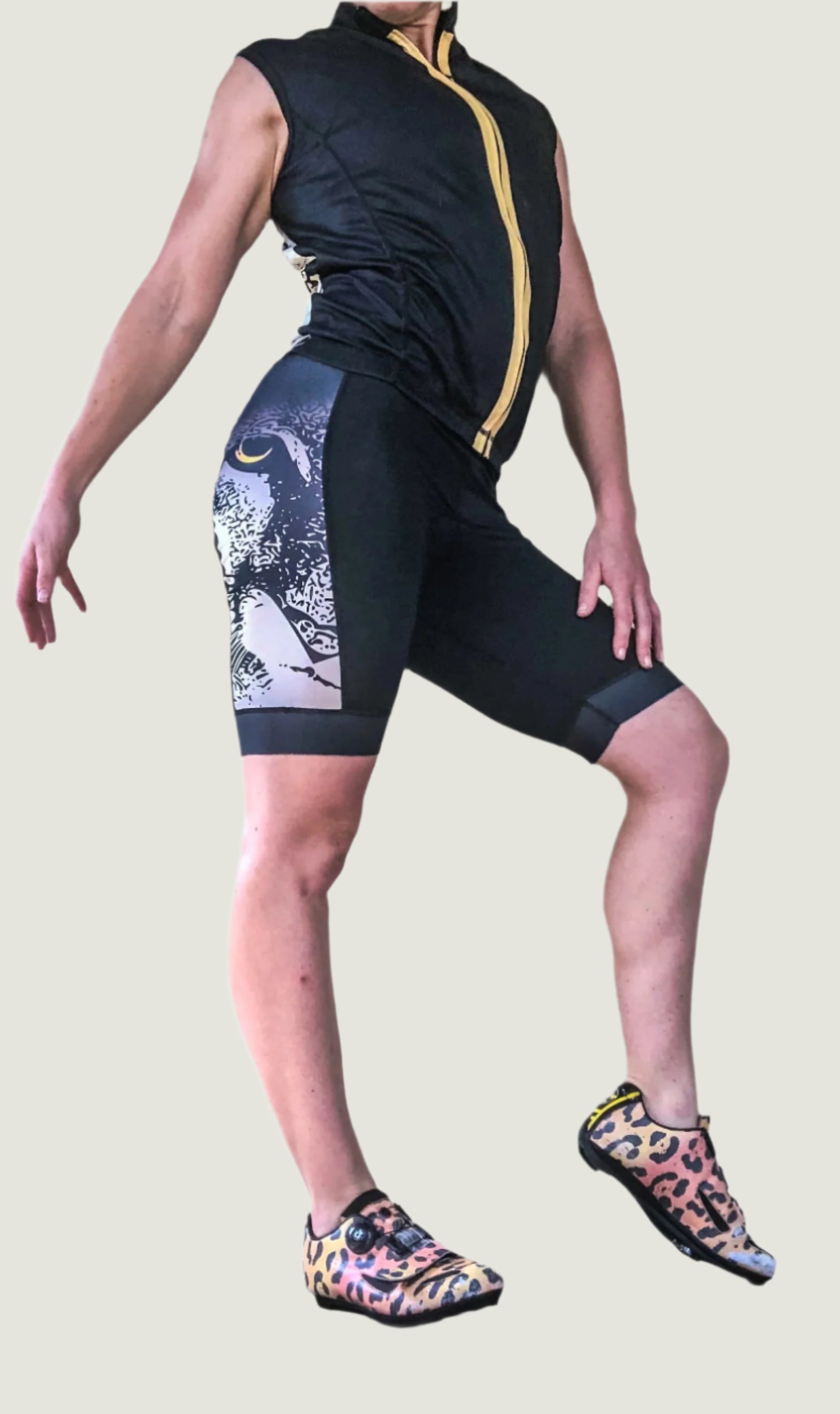 Ride up the highest of gradients with our freakily unique RFA Pro-Grade Mountain Lion Sleeveless Leopard Cycling Bib. This bib is seriously sexy, and can be used to up style your outdoor and indoor cycle activities.